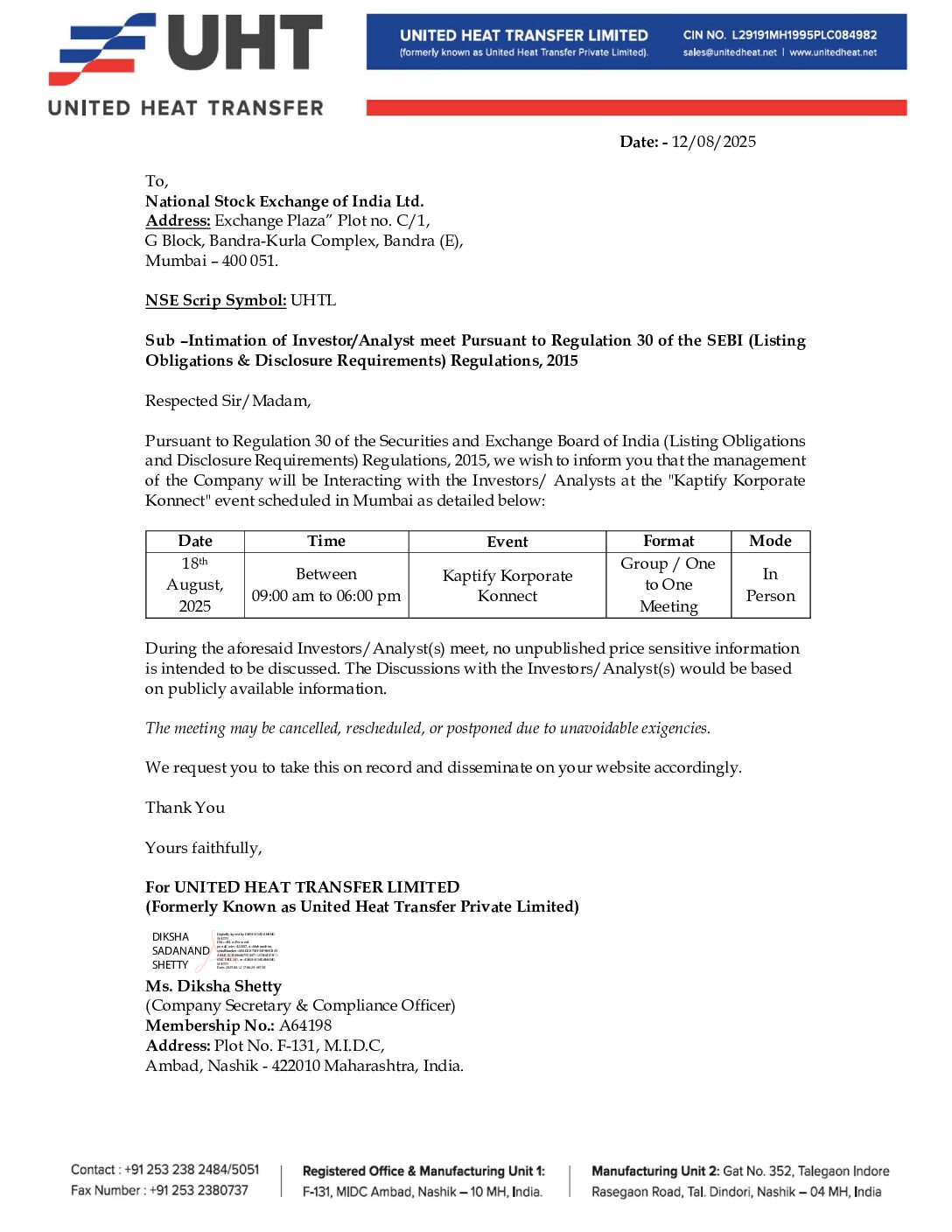 UHTL- Intimation of Investor Meet 12.08.2025 By unitedheat.net August 19, 2025 No Comments Continue Reading
